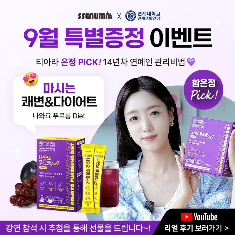 쎈엄마 X 연세생활건강이 뭉쳤다! 변비로 고생하는 우리 가족을 위한 선물♥ 티아라 은정이 추천하는 '나와요푸르릉다이어트' 상콤한 푸룬 주스 맛으로 매일 맛있게, 더 가볍게! 쎈엄마 강연 듣고 푸짐한 선물의 주인공이 되어보세요. ▶연세생활건강 나와요 푸르릉 Diet (1BOX) 강연장에서 추첨을 통해 선물로 드립니다. :) 무료 강연도 듣고 푸짐한 선물도 받아가세요♥
