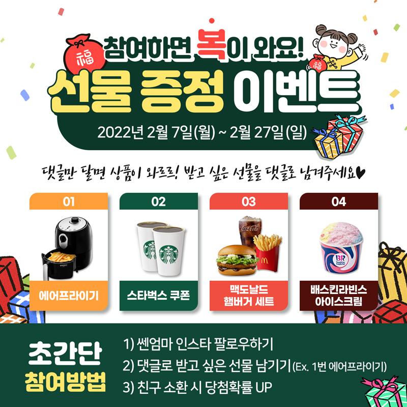 많은 분들이 기다려주신 쎈엄마 팔로우 이벤트! 2월엔 무료 선물 증정 이벤트를 진행해요 :) ♥ 누구나! 팔로우 하고 간단하게 댓글만 달면 추첨을 통해 선물을 드리고 있어요! 행운의 주인공이 내가 될지도 모르니 원하는 상품이 있다면 지금 바로 댓글 남겨주세요!! [기간] 2022년 2월 7일 (월) ~ 2월 27일 (일) [당첨인원] 10명 [참여방법] 1. 쎈엄마 인스타그램 계정 팔로우 하기 + 해당 게시물 좋아요 꾸욱~ 2. 댓글에 받고 싶은 선물 작성 + 함께 응모하고 싶은 @친구 소환 ※ 예시 : 1번 에어프라이기 받고 싶어요! @ssen_mother *비공개 계정, 이벤트 전문 계정은 당첨 제외됩니다~ ![]() [발표] 2022년 2월 28일 (월) *당첨자분께 개별 연락 (DM) 드립니다. [경품] 1. 에어프라이기 2. 스타벅스 아메리카노 쿠폰 3. 맥도날드 햄버거 세트 4. 배스킨라빈스 아이스크림 ♥ 많은 참여 부탁드립니다 ♥ |