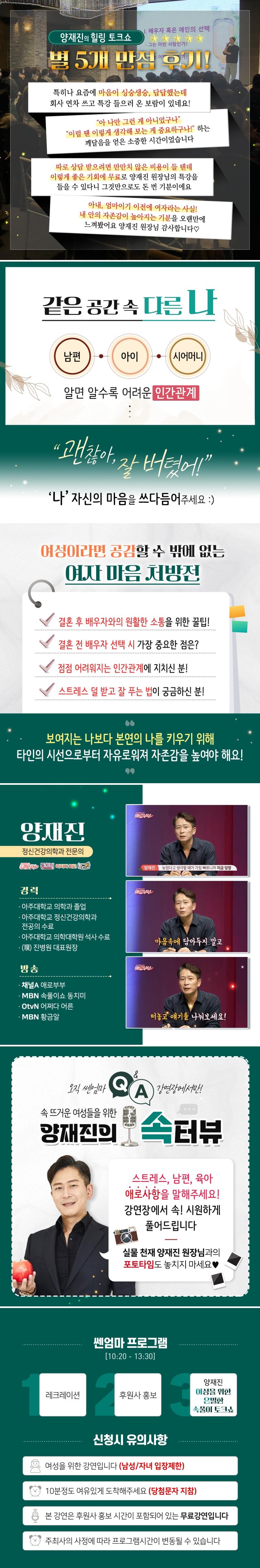 + 본 강연은 후원사 홍보시간이 포함되어 있는 무료 강연입니다. + 25세 이상 여성분들만 신청 가능 (자녀와 남편은 다음에~) + 입장 마감시간은 10시 40분입니다. + 선착순으로 입장하며 자유석입니다. |