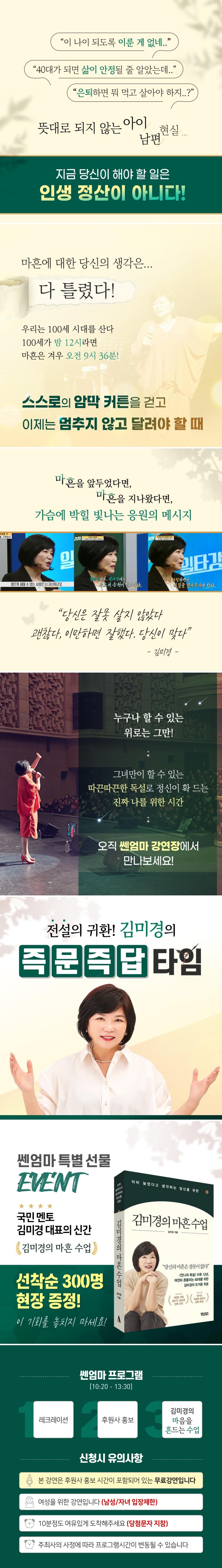 + 본 강연은 후원사 홍보시간이 포함되어 있는 무료 강연입니다. + 25세 이상 여성분들만 신청 가능 (자녀와 남편은 다음에~) + 입장 마감시간은 10시 40분입니다. + 선착순으로 입장하며 자유석입니다. |