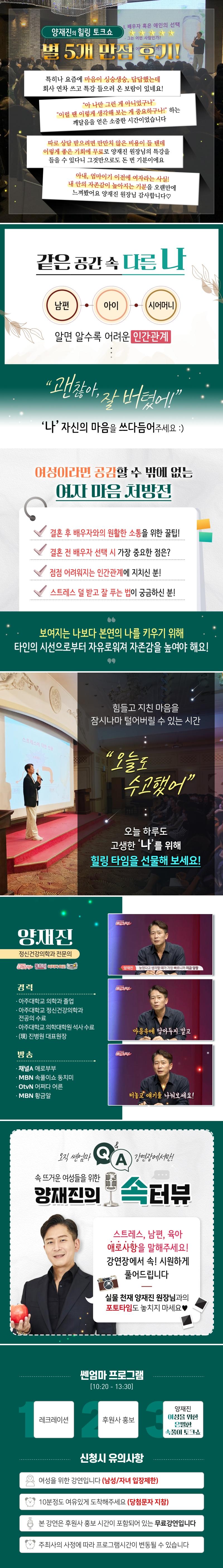 + 본 강연은 후원사 홍보시간이 포함되어 있는 무료 강연입니다. + 25세 이상 여성분들만 신청 가능 (자녀와 남편은 다음에~) + 입장 마감시간은 10시 40분입니다. + 선착순으로 입장하며 자유석입니다. |