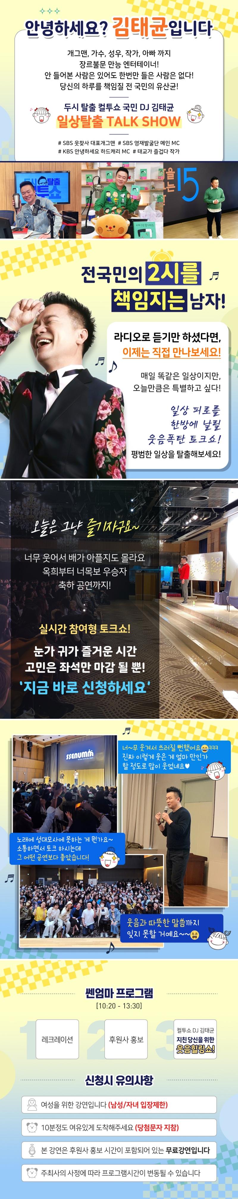 + 본 강연은 후원사 홍보시간이 포함되어 있는 무료 강연입니다. + 25세 이상 여성분들만 신청 가능 (자녀와 남편은 다음에~) + 입장 마감시간은 10시 40분입니다. + 선착순으로 입장하며 자유석입니다. |