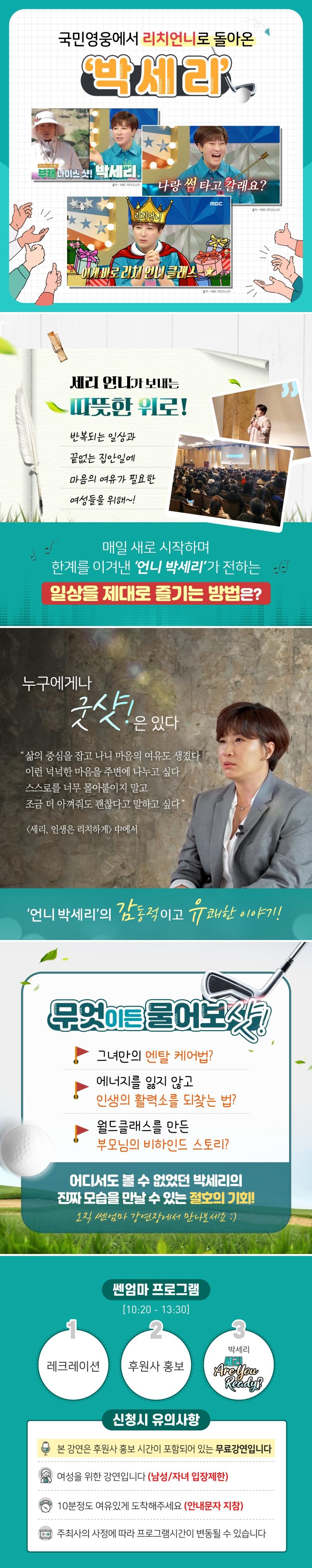 ex) 홍길동 / 수원 박세리 ※ 신청 후 , 평일 기준 1~3일 이내 안내문자 보내드릴게요 :) ★ 강연 필독 유의사항 ★ + 본 강연은 후원사 홍보시간이 포함되어 있는 무료 강연입니다. + 25세 이상 여성분들만 신청 가능 (자녀와 남편은 다음에~) + 입장 마감시간은 10시 40분입니다. + 선착순으로 입장하며 자유석입니다. |