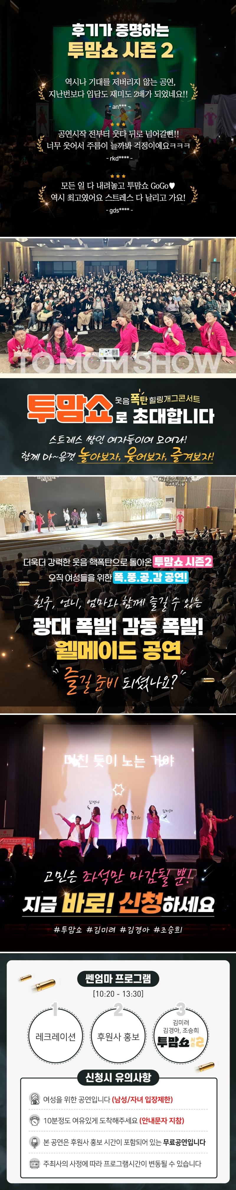 + 본 공연은 후원사 홍보시간이 포함되어 있는 무료 공연입니다. + 25세 이상 여성분들만 신청 가능 (자녀와 남편은 다음에~) + 입장 마감시간은 10시 40분입니다. + 선착순으로 입장하며 자유석입니다. |